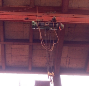 一種操作方法是:利用梯子到達(dá)平臺處,在一根鋼絲繩的兩端分別捆上麻繩,吊上合適的配重物資,把麻繩蕩到單梁的兩側(cè),鋼絲繩的中間點用麻繩拉住,等兩端的鋼絲繩都到下面的平臺了,要連個人在線面分開拉鋼絲繩,中間的麻繩往上提,使鋼絲繩躲過軌道上的兩輪凸起結(jié)構(gòu)件,再把鋼絲繩移到單梁的中間部位,再兩鋼絲繩頭都拉到平臺處,用手拉葫蘆一點點的把單梁葫蘆拉到檢修平臺的上方。