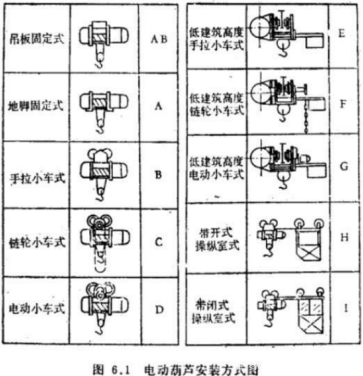 1、吊板固定式;2、地腳固定式;3、手拉小車式;4、鏈輪小車式;5、電動小車式;6、低建筑高度手拉小車式;7、低建筑高度鏈輪小車式;8、低建筑高度電動小車式;9、帶開式操縱室式;10:帶閉式操縱室式。